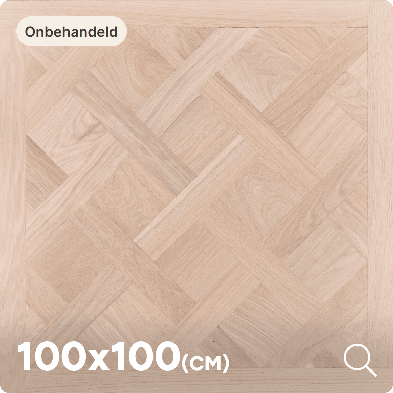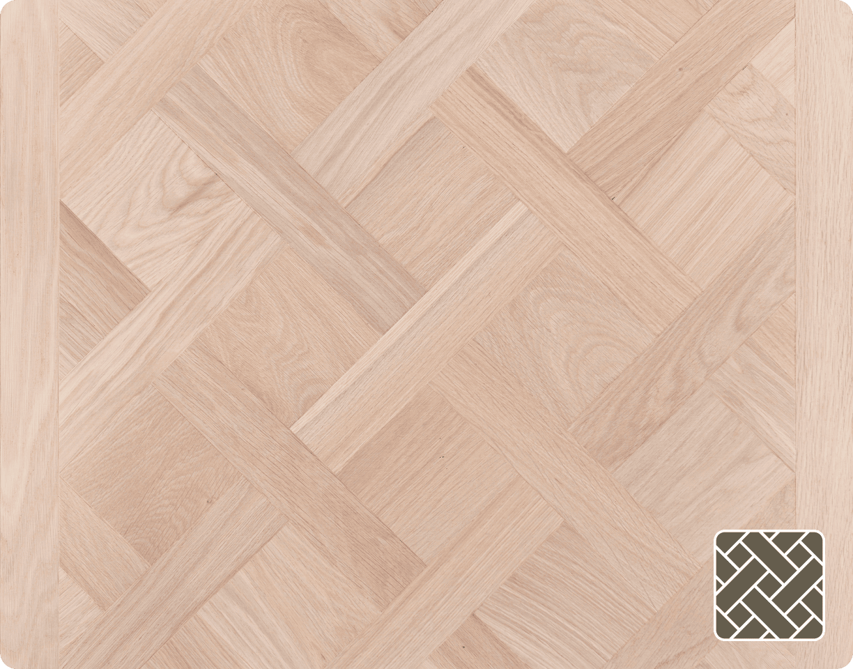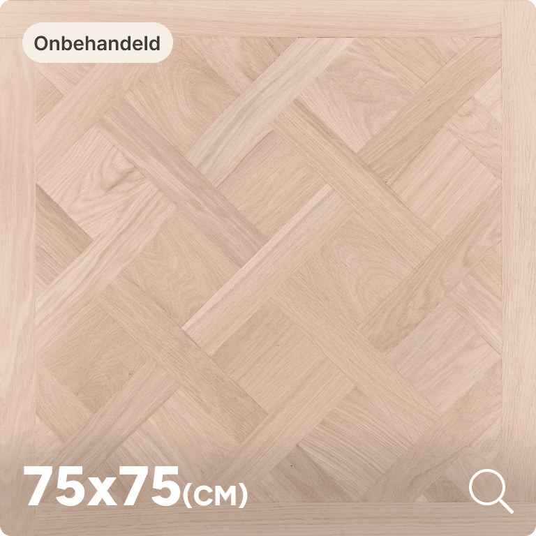 De eiken Versailles vloer combineert klassieke elegantie met moderne kwaliteit. Elk paneel is opgebouwd uit een multiplex onderlaag en een gezaagde eiken toplaag van 4 mm. Dat zorgt voor een stabiele, duurzame en vormvaste vloer met een luxe uitstraling.